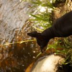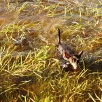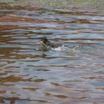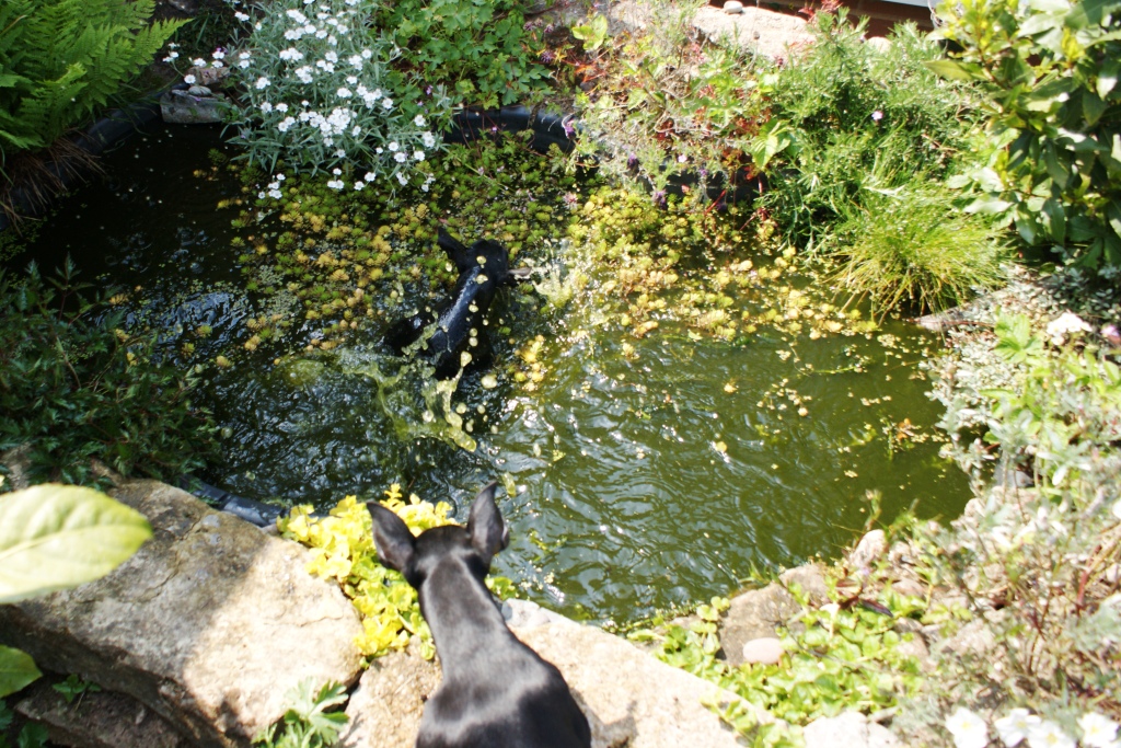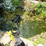 We give our puppies a shallow bucket of water to play in and they enjoy dropping toys in and fishing them out again. There is a small wildlife pond in our garden (which little pups can’t reach but they can see and smell) and the older dogs often play at ‘accidentally’ dropping floating toys into the pond which need to be retrieved – usually by a passing human because if we leave them to it the game ends with a wet trail of stinky weed and muddy footprints galloped through the house in a triumphant lap of honour.