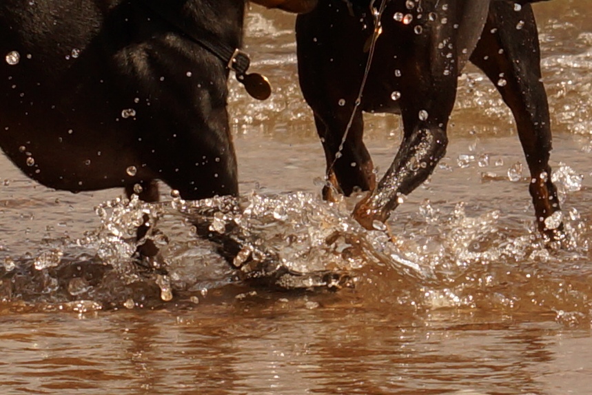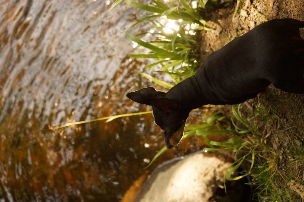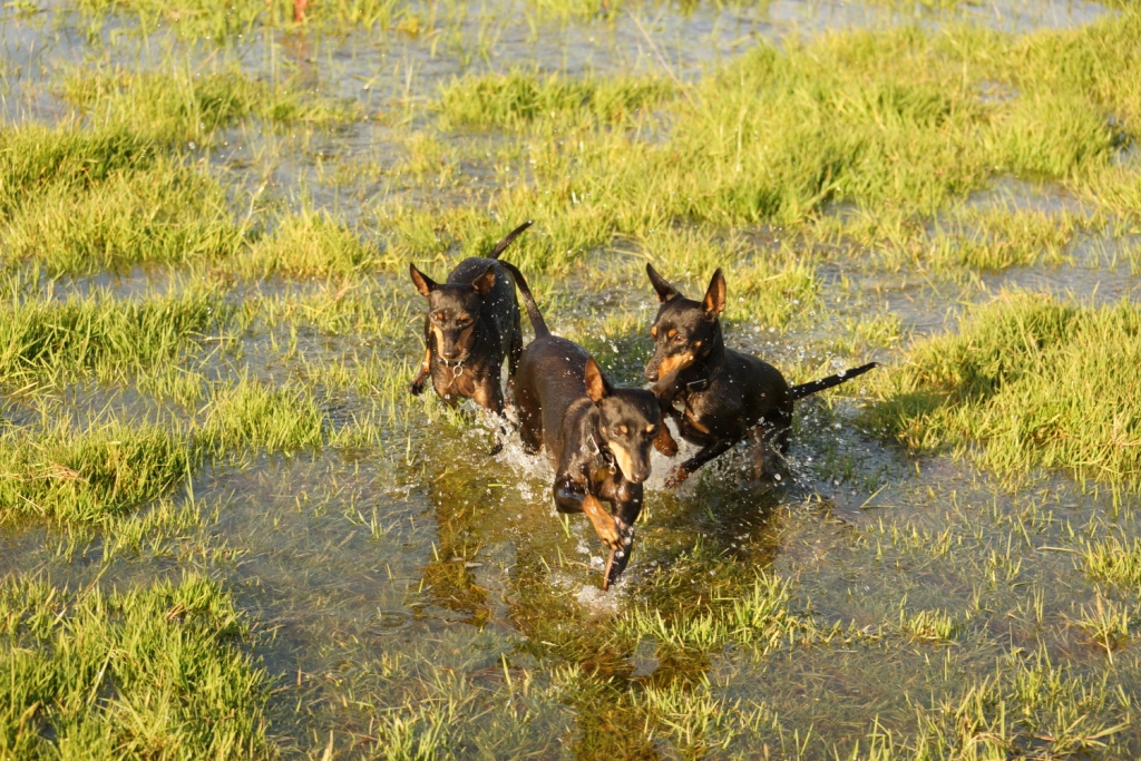 There are a handful of breeders and owners who, like us, report that their black and tans do enjoy swimming and splashing and playing in wet stuff. Surely there must be something suspicious happening if an ETT is contemplating getting their paws wet?