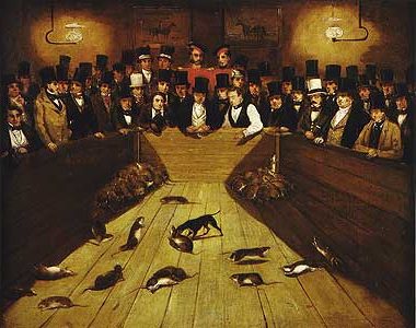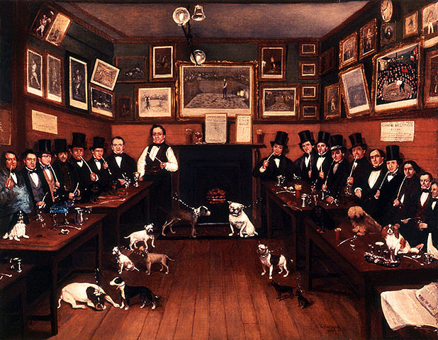 If you can (and there must be very few valid excuses for a real enthusiast) buy a last minute travel ticket and make the journey to London to see this exhibition and then spend some time in the wonderful treasure trove of history that is the Kennel Club Library. See with your own eyes the 1850’s oil painting of five and a half pound “Tiny the Wonder” at work in the rat pit at the Blue Anchor Tavern; and another just a few years later, of one of the first “dog shows” held at the Queens Head Tavern after rat baiting was banned.